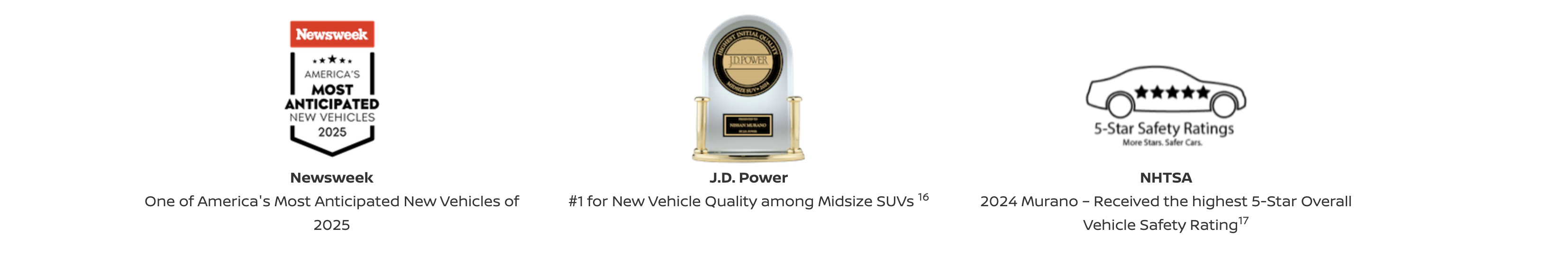 20 Nissan Murano received the highest total number of awards compared to all other midsize SUVs in the J.D. Power 2025 U.S. Vehicle Dependability Study and 2024 U.S. Initial Quality Study. Awards based on 2022 & 2024 models, respectively, newer models may be shown. Visit https://www.jdpower.com/business/awards for more details.