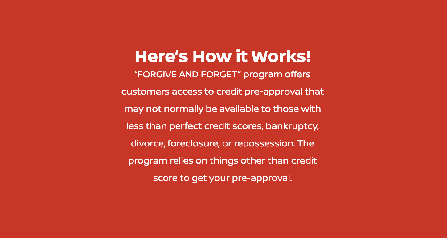 Your credit score is a track record of your payment history. It’s usually used to pre-approve you for future loans or credit. Sometimes things happen, like a late payment, and that can reduce your score, even though you are perfectly capable of making payments. To dealerships, your score may be low, and they may be fearful to pre-approve your car loan. With the “FORGIVE AND FORGET” program at Summerville Nissan, we look at your job to tell us whether you can afford to buy a vehicle.