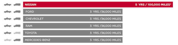 However, there is an alternative: Nissan. Pioneering the way commercial vehicle warranties works, Nissan has crafted the most progressive, SMB-friendly truck and van coverage in the country. Most new Nissan TITAN, TITAN XD, NV200, NV Cargo, and NV Passenger models are covered for up to 5 years or 100,000 miles. For business owners, that added peace of mind is priceless.